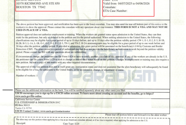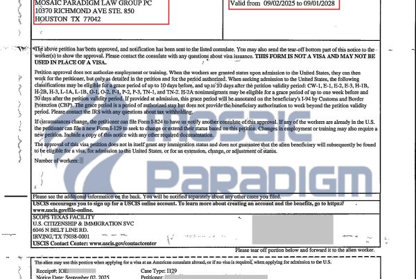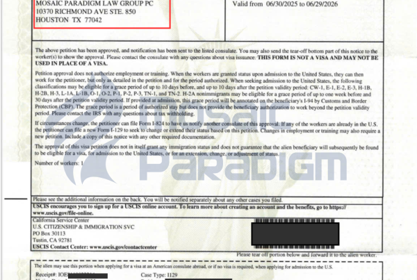 Mosaic Paradigm rất vui mừng thông báo rằng đơn I-129 diện visa L-1A của một trong những khách hàng lớn của chúng tôi đã nhận được Approval Notice từ Cơ…