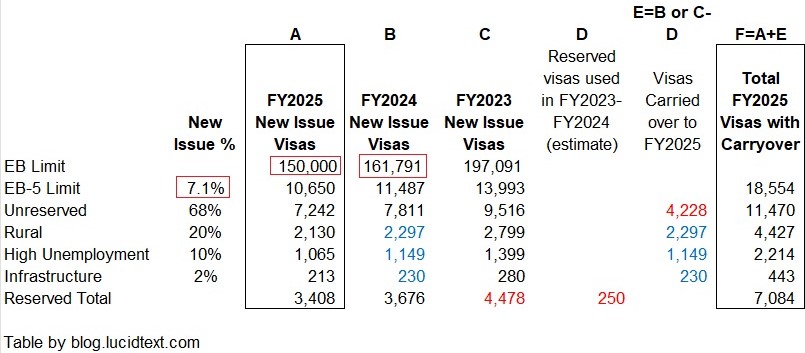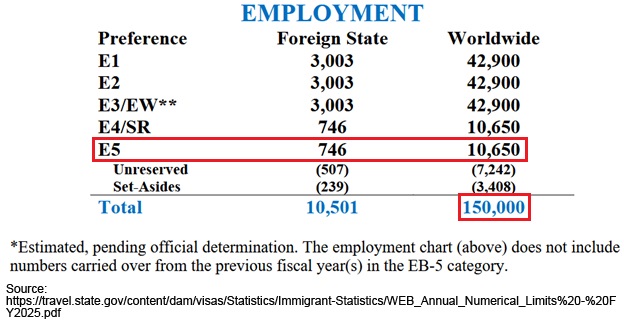 Trong số đó, chương trình EB-5 chiếm 7,1% tương đương khoảng 10,650 thị thực toàn cầu mới trong năm tài chính 2025 cùng với lượng thị thực chuyển tiếp từ các năm trước, bao gồm 7,242 Visa EB-5 Không dành riêng toàn cầu và 3,408 Visa Dành riêng toàn cầu.