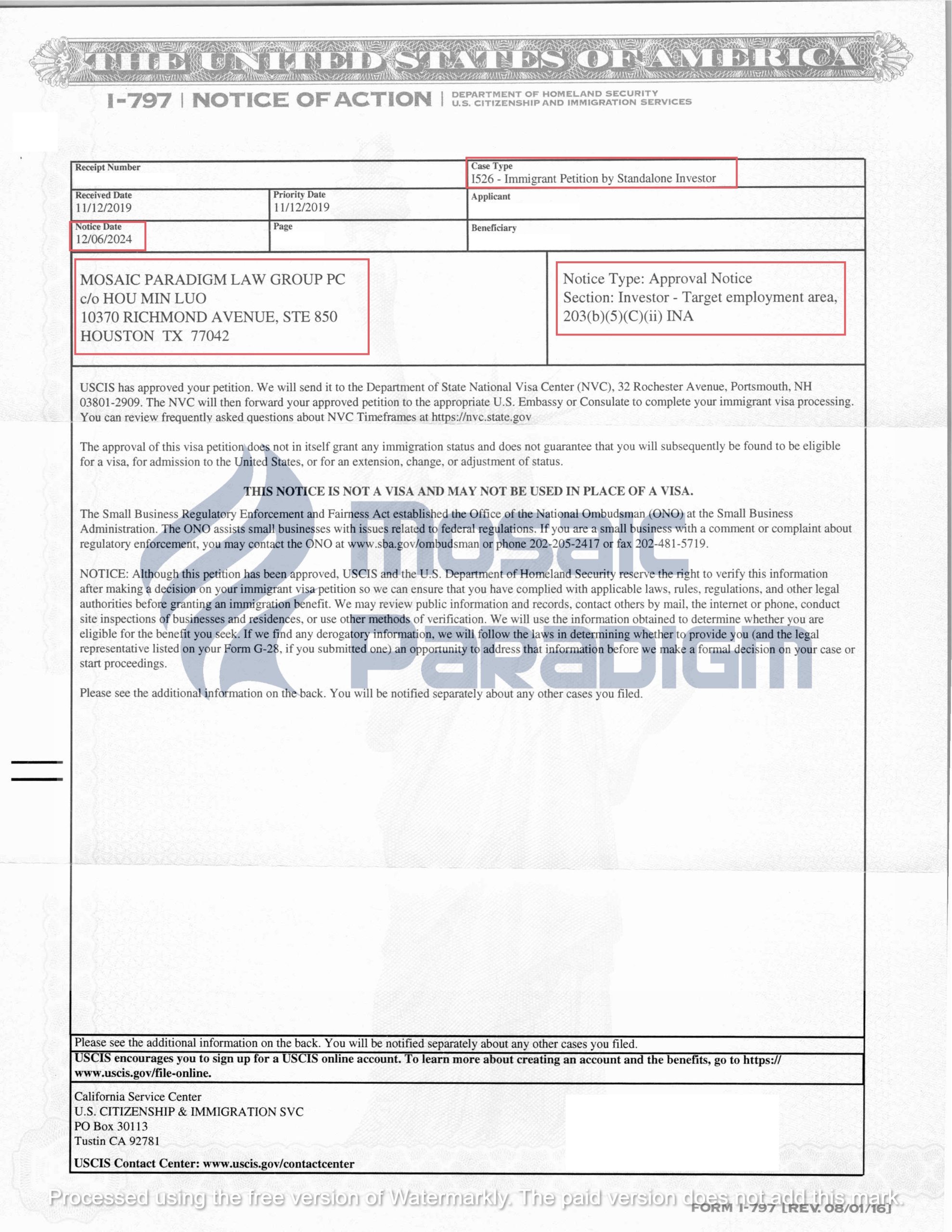 Khởi đầu năm mới 2025, Mosaic Paradigm đón nhận tin vui khi các khách hàng EB-5 của chúng tôi được USCIS phê duyệt thành công 3 đơn I-526. Đây là bước ngoặt mở ra những cơ hội mới, đánh dấu cột mốc quan trọng trên con đường chinh phục mục tiêu định cư tại Hoa Kỳ của các nhà đầu tư EB-5.