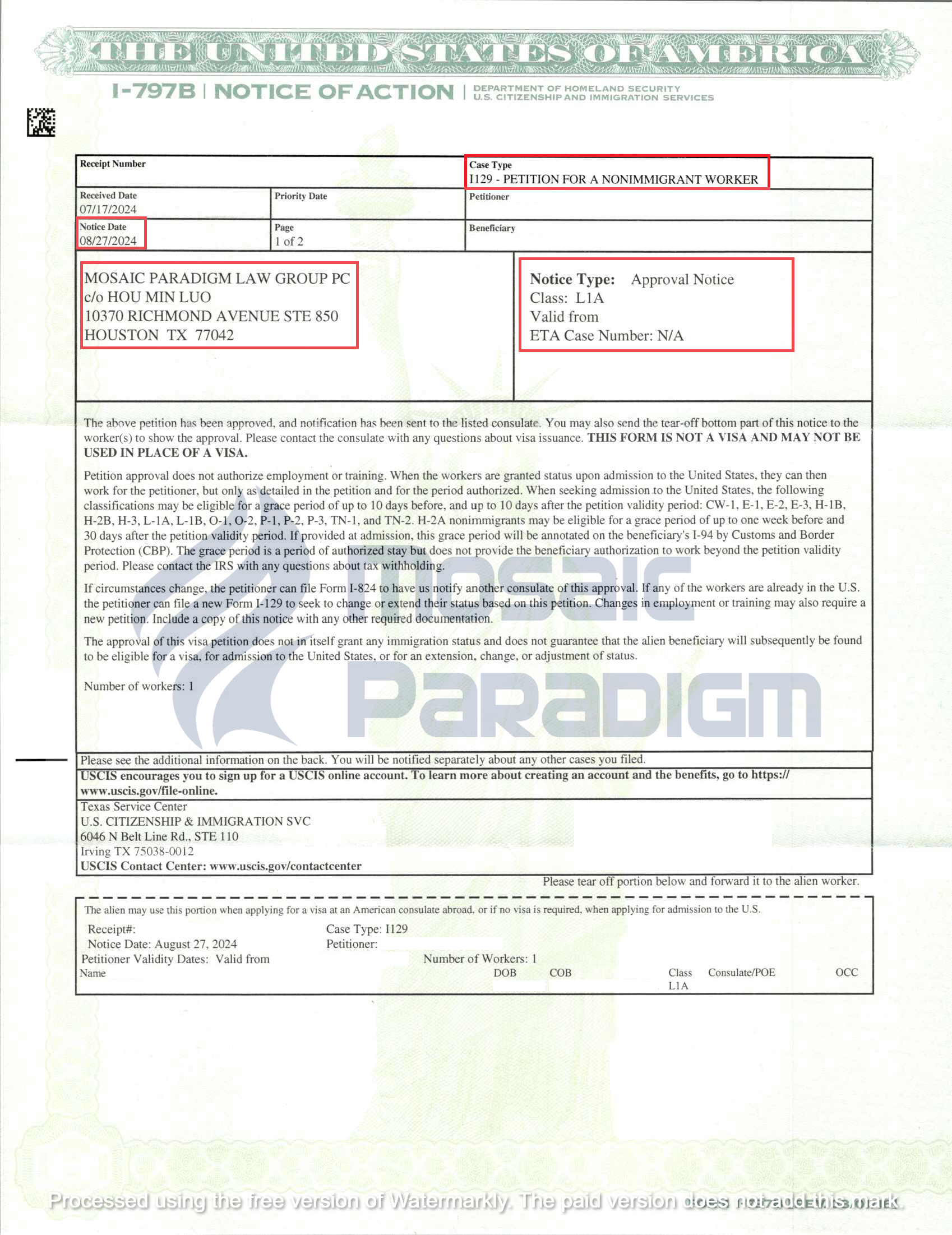 Mosaic Paradigm rất vui mừng thông báo rằng đơn I-129 diện visa L-1A của một trong những khách hàng lớn của chúng tôi đã nhận được Approval Notice từ Cơ quan Di trú và Nhập tịch Hoa Kỳ (USCIS).