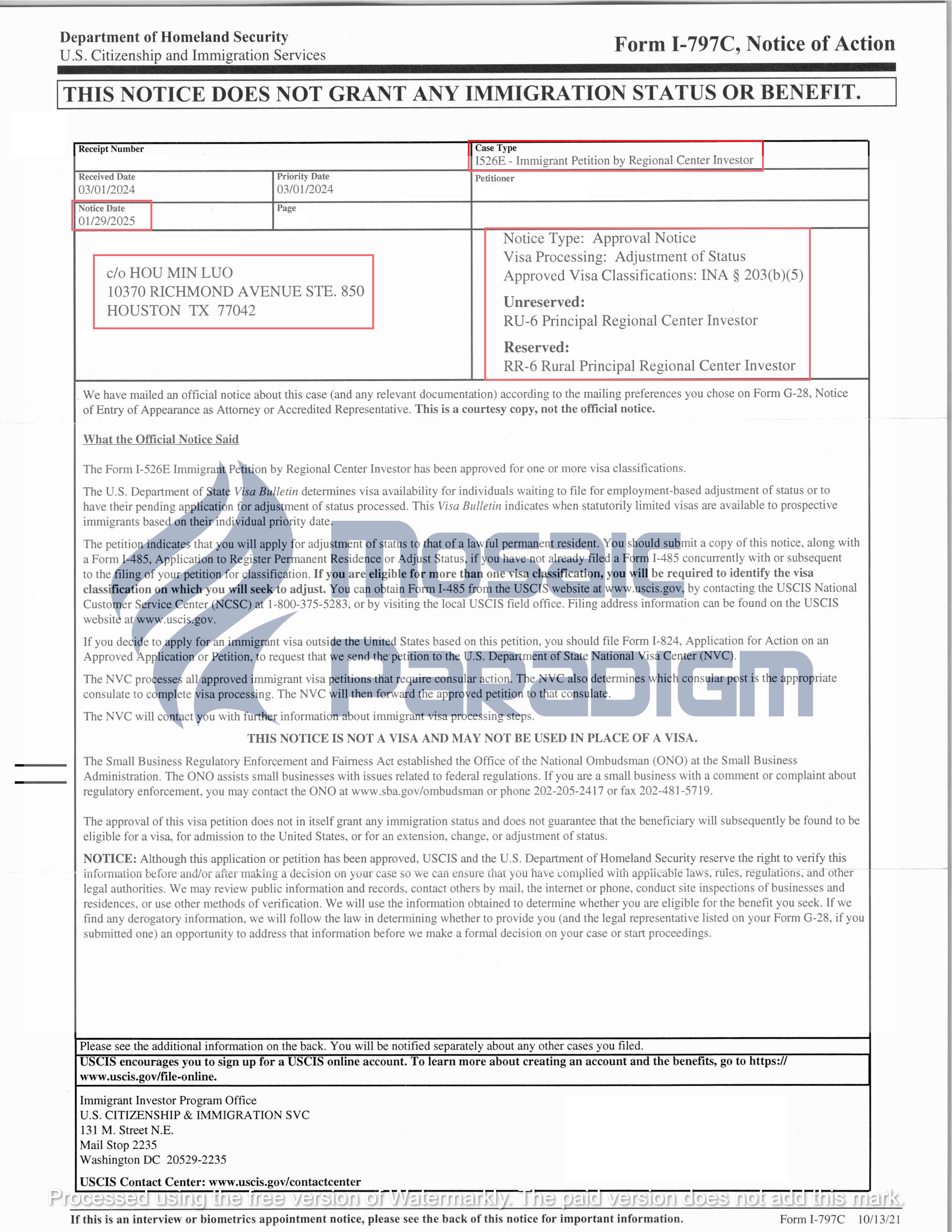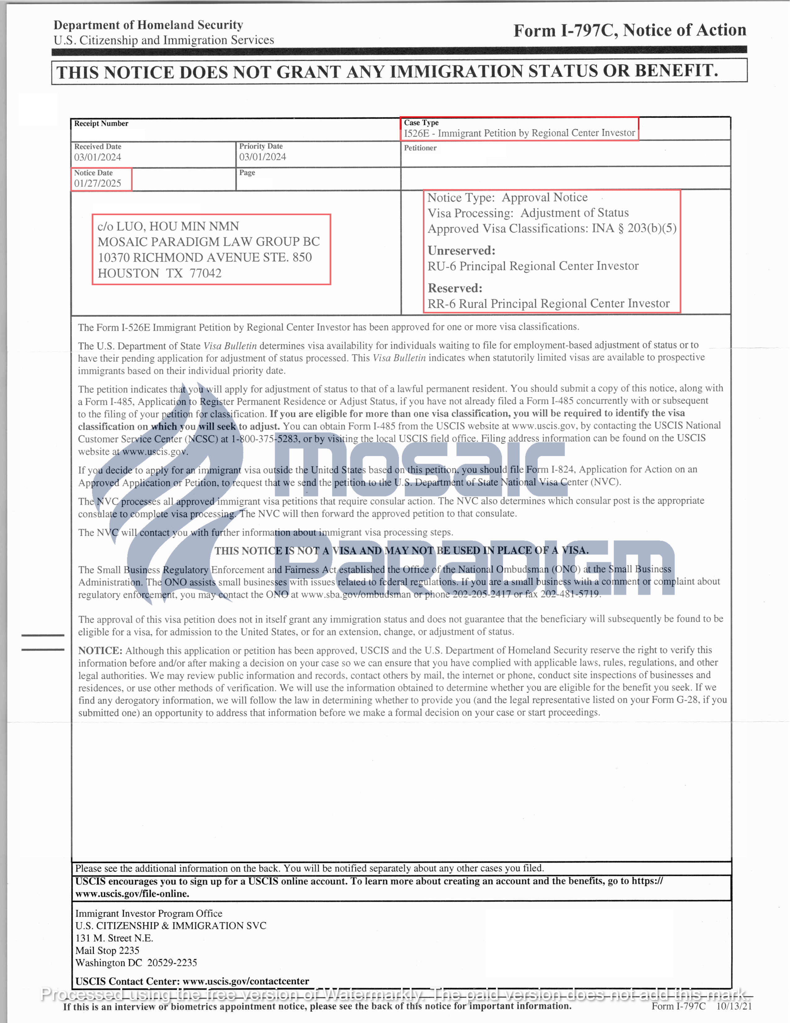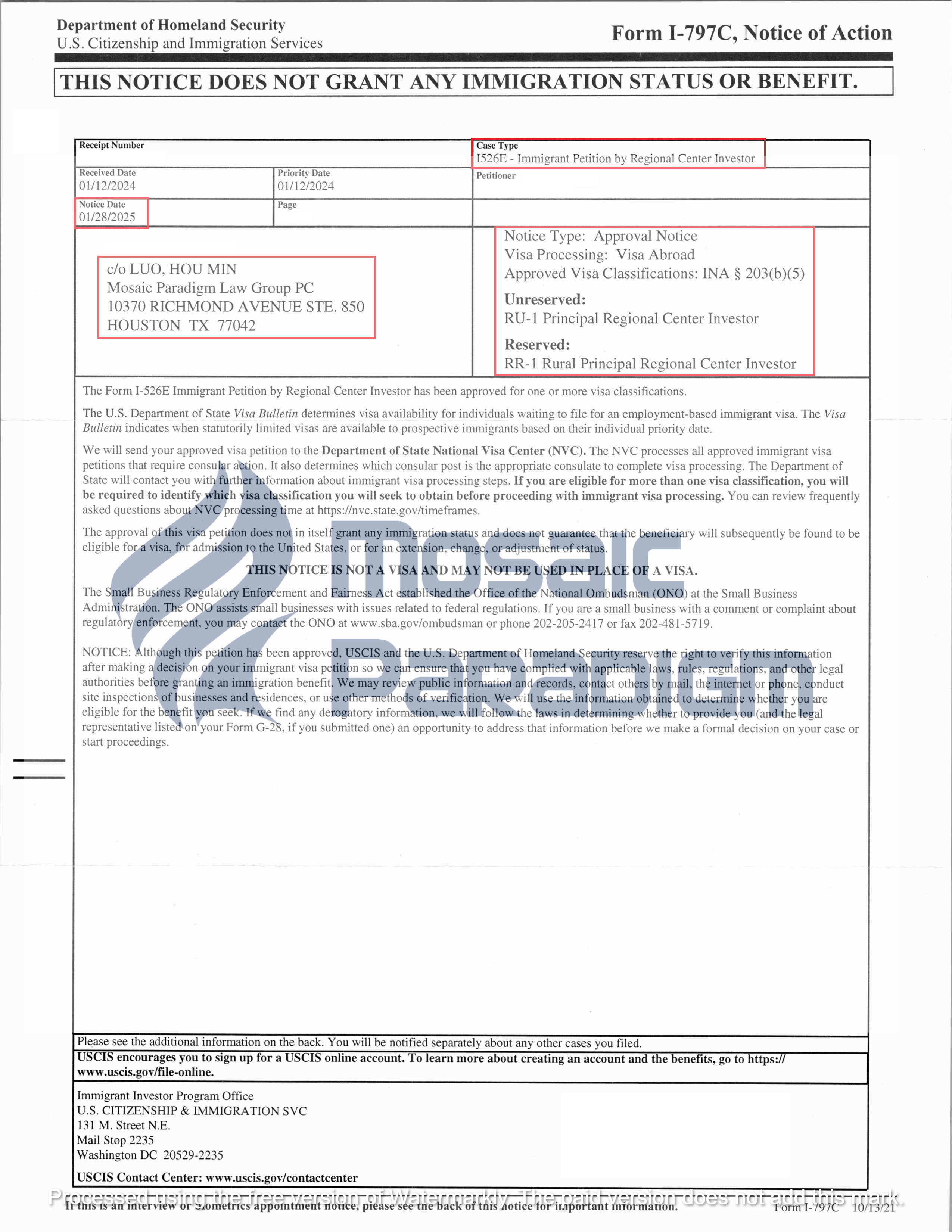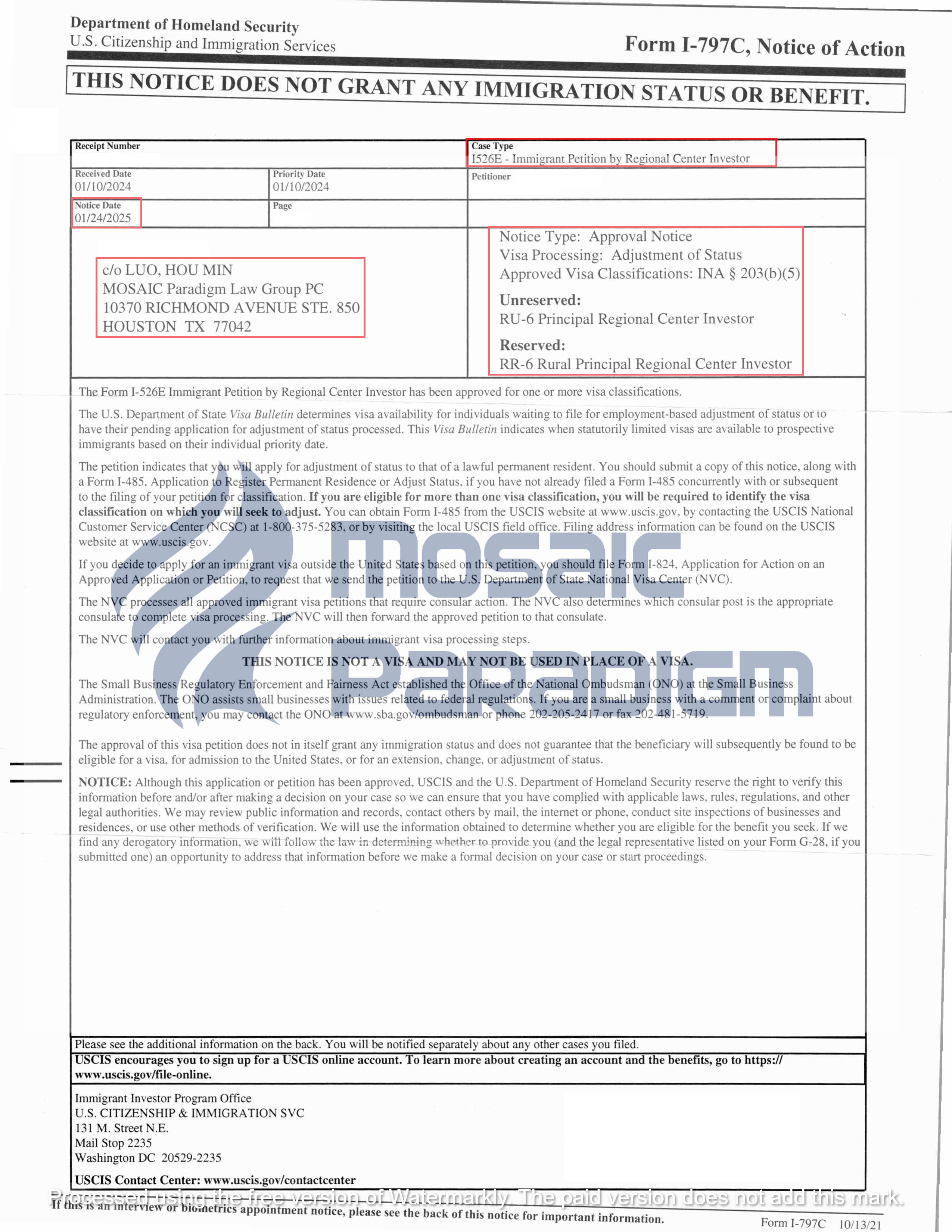 Mosaic Paradigm khởi đầu tháng 2 đầy khởi sắc khi các nhà đầu tư EB-5 của chúng tôi liên tiếp thành công đạt được chấp thuận 4 đơn I-526E diện đầu tư gián tiếp thông qua Trung tâm Vùng.