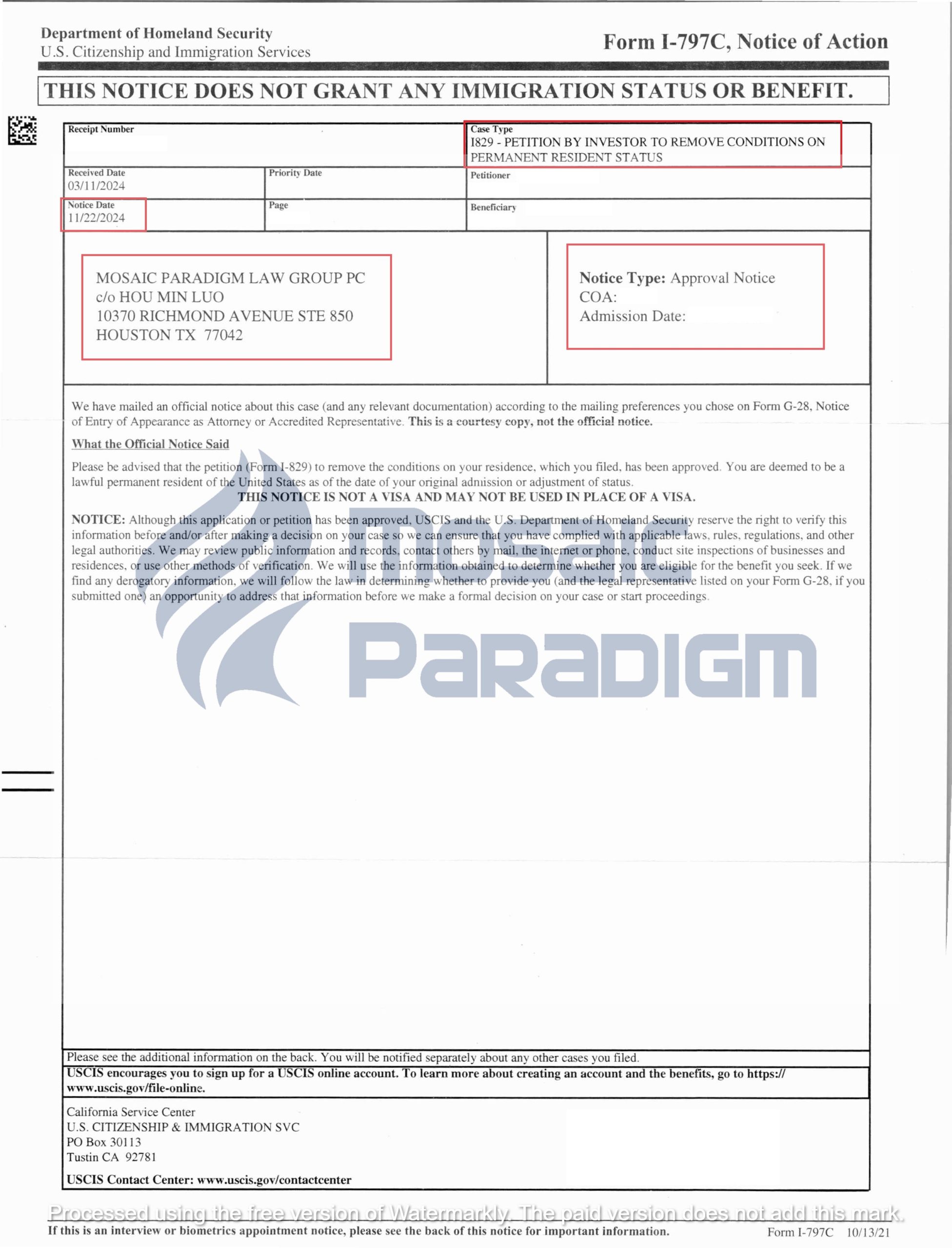 Mosaic Paradigm xin chúc mừng khách hàng EB-5 và gia đình đạt được chấp thuận 2 đơn I-829 thành công!