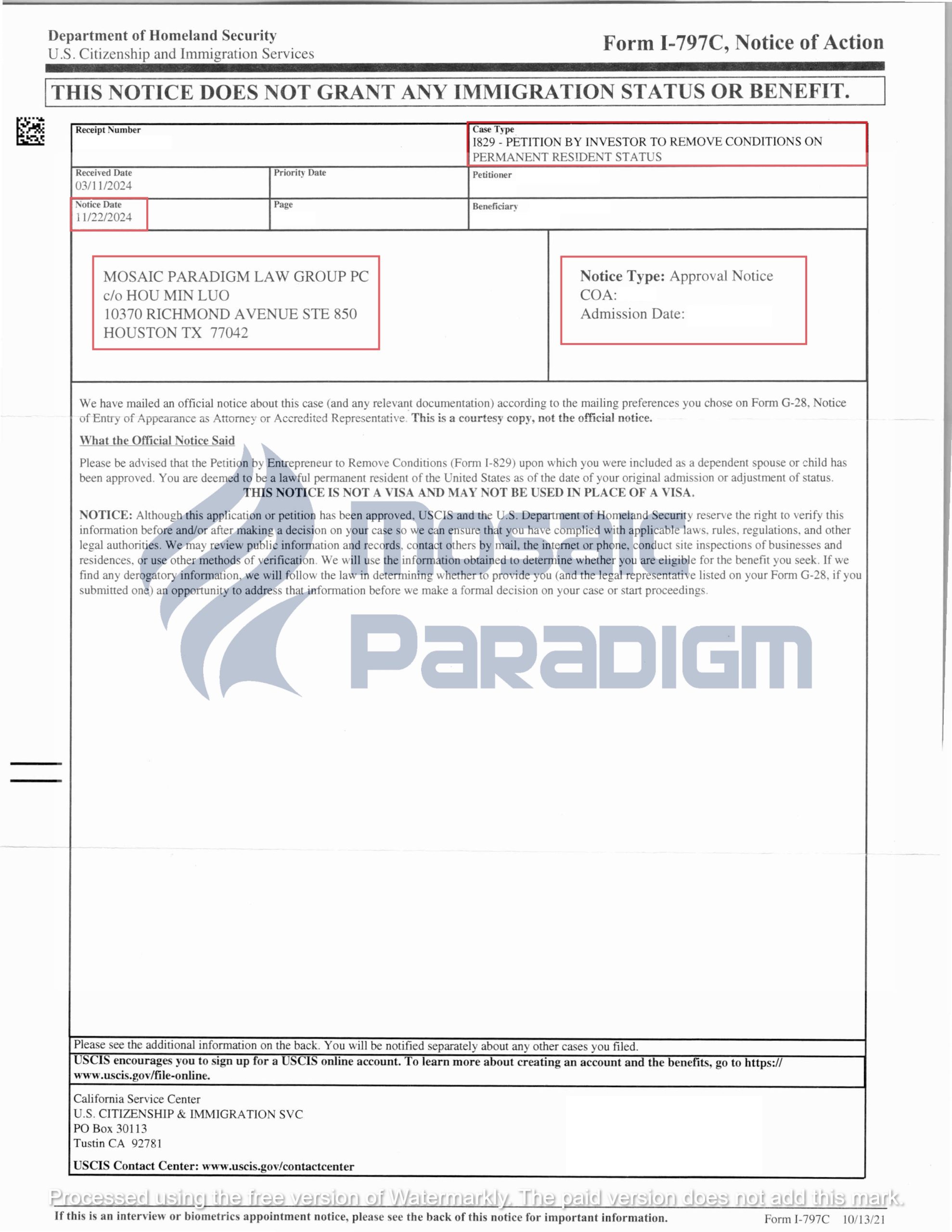 Mosaic Paradigm xin chúc mừng khách hàng EB-5 và gia đình đạt được chấp thuận 2 đơn I-829 thành công!