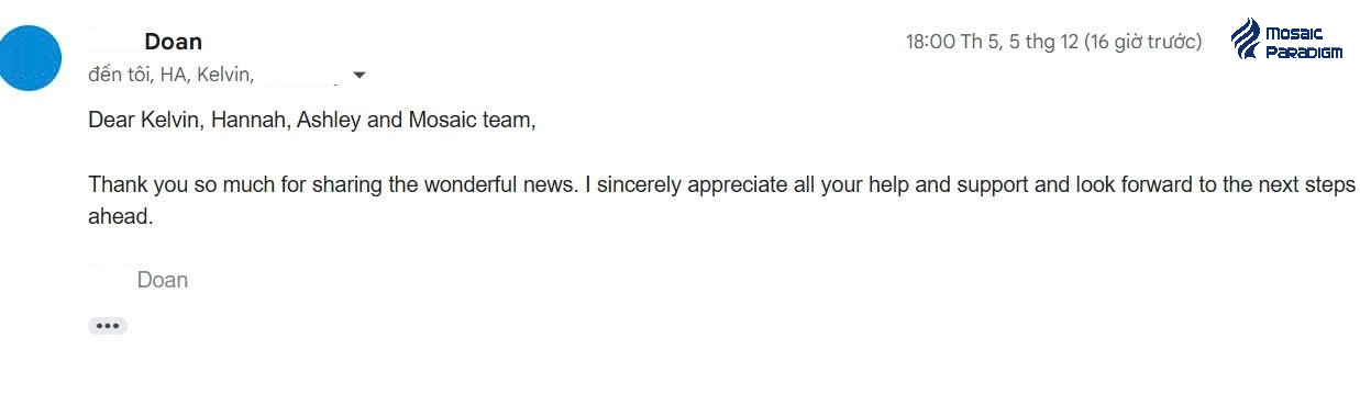 Email cảm ơn của khách hàng gửi đến Luật sư Kelvin và Đội ngũ Mosaic Paradigm
