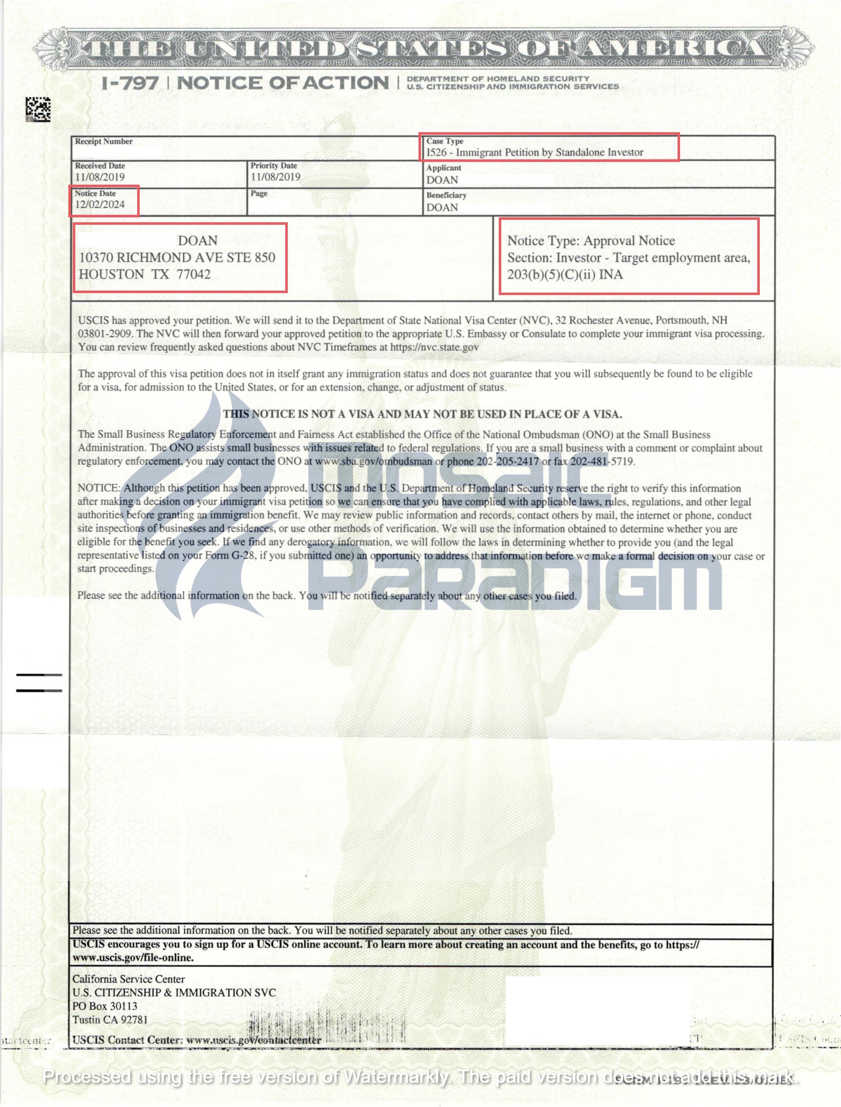 Mosaic Paradigm vô cùng vui mừng chia sẻ tin vui: Khách hàng EB-5 của chúng tôi đã chính thức đạt được chấp thuận đơn I-526 – đơn xin nhập cư cho Nhà đầu tư EB-5 nước ngoài từ Sở Di trú Mỹ (USCIS) sau khi nộp thành công bổ sung bằng chứng (RFE) và nhận giấy Approval Notice nhanh chóng sau 2 tuần.