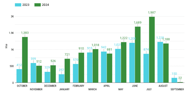 Số lượng visa cấp hàng tháng đã đạt đỉnh từ tháng 5 đến tháng 8 năm 2024, với 6,086 visa (hơn 50% tổng số visa trong cả năm) được xử lý chỉ trong bốn tháng này theo ( xem ảnh 1 ). Chỉ có 22 visa EB-5 được cấp trong tháng 9 năm 2024, có khả năng do hết hạn ngạch visa EB-5 Không được bảo lưu vào cuối năm tài khóa.