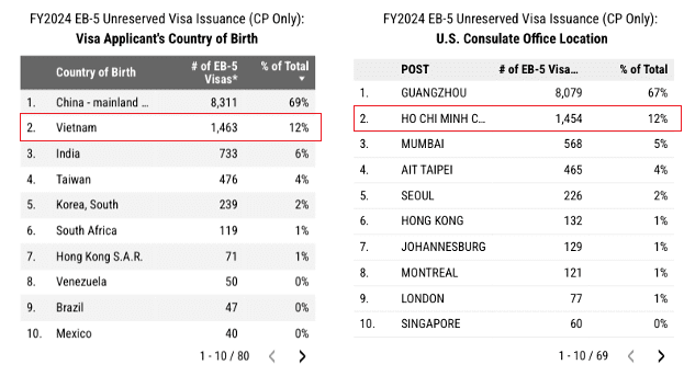 Người nộp đơn từ Trung Quốc Đại lục, Việt Nam, Ấn Độ, Đài Loan và Hàn Quốc tiếp tục là nhóm nhà đầu tư lớn nhất nhận thị thực EB-5 trong năm tài chính 2024, chiếm tổng cộng 93% tổng số thị thực EB-5 được cấp ( xem ảnh 2 ). Đáng chú ý, Việt Nam đều đứng ở vị trí thứ 2 ở cả hai bảng, chỉ xếp sau Trung Quốc. Cụ thể trong năm tài khóa 2024, có 1,463 visa EB-5 được cấp cho các đương đơn Việt Nam, chiếm 12% tổng số visa EB-5 trên toàn thế giới trong năm này.
