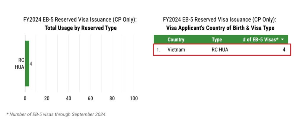 Đặc biệt, các visa EB-5 Bảo lưu đầu tiên đã được cấp cho các đương đơn Việt Nam tại Lãnh sự quán Hoa Kỳ ở Thành phố Hồ Chí Minh vào tháng 8 năm 2024 – bốn (4) visa Bảo lưu này được xử lý theo diện Khu vực Có Tỷ lệ Thất nghiệp Cao. Không có visa EB-5 Bảo lưu nào khác được cấp thông qua quy trình xét duyệt hồ sơ tại Lãnh sự quán trong năm tài khóa 2024, ngoại trừ các visa đã được xử lý tại Thành phố Hồ Chí Minh ( xem ảnh 3 ).
