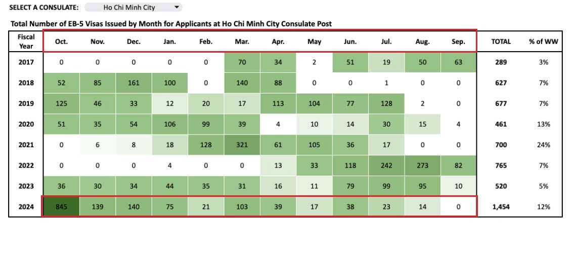 Tổng quan, trong năm tài khóa 2024, sau khi cấp 845 visa chỉ trong tháng 10 năm 2023, số lượng hồ sơ xin thị thực EB-5 được xử lý tại Lãnh sự quán Hoa Kỳ ở Thành phố Hồ Chí Minh đã giảm đi đáng kể ( xem ảnh 4 ).