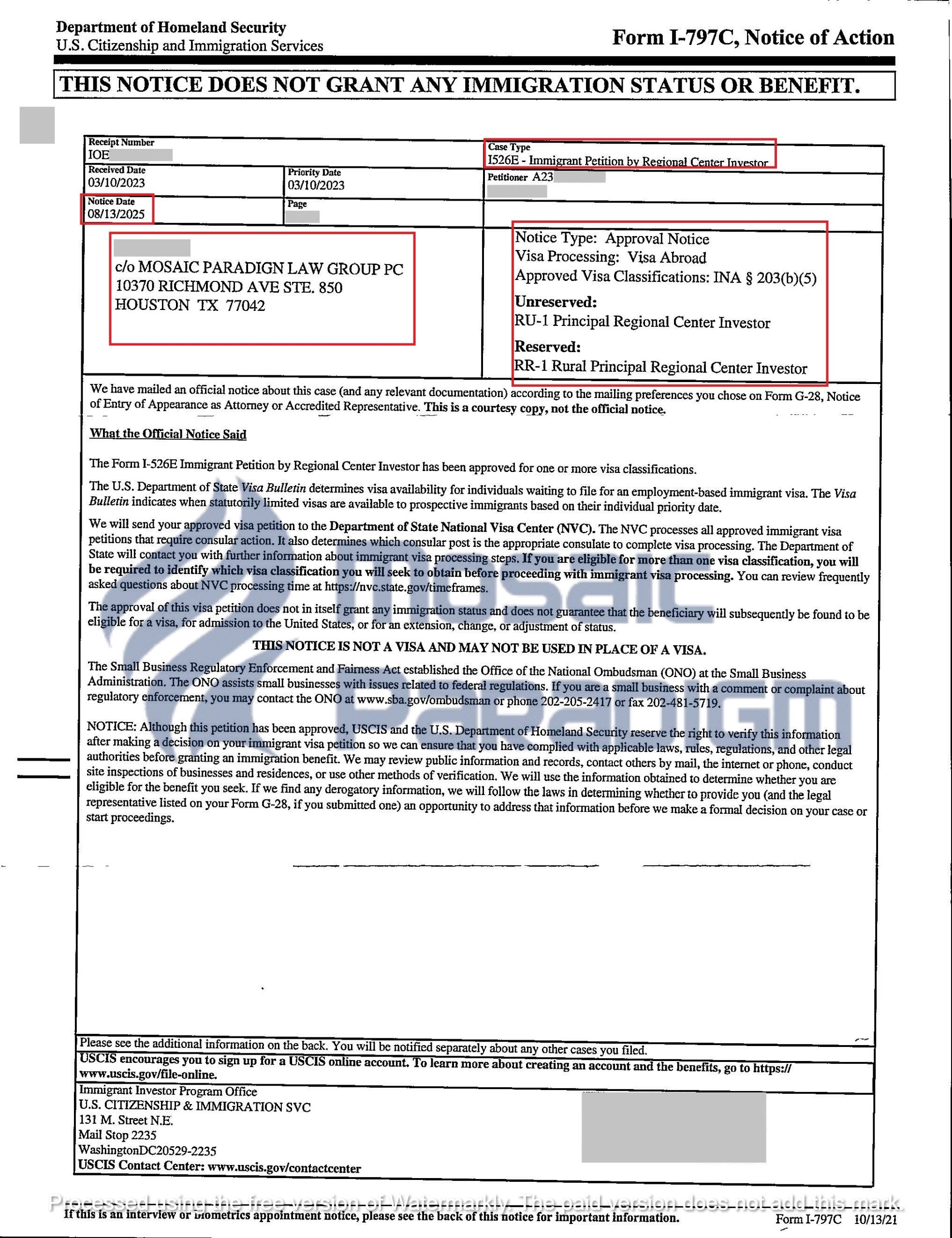 Với cột mốc này, Mosaic Paradigm sẽ tiếp tục đồng hành cùng Quý Nhà đầu tư trong các bước tiếp theo của quy trình EB-5, hướng tới một tương lai ổn định và bền vững tại Hoa Kỳ với thẻ xanh vĩnh viễn cho toàn thể gia đình.
