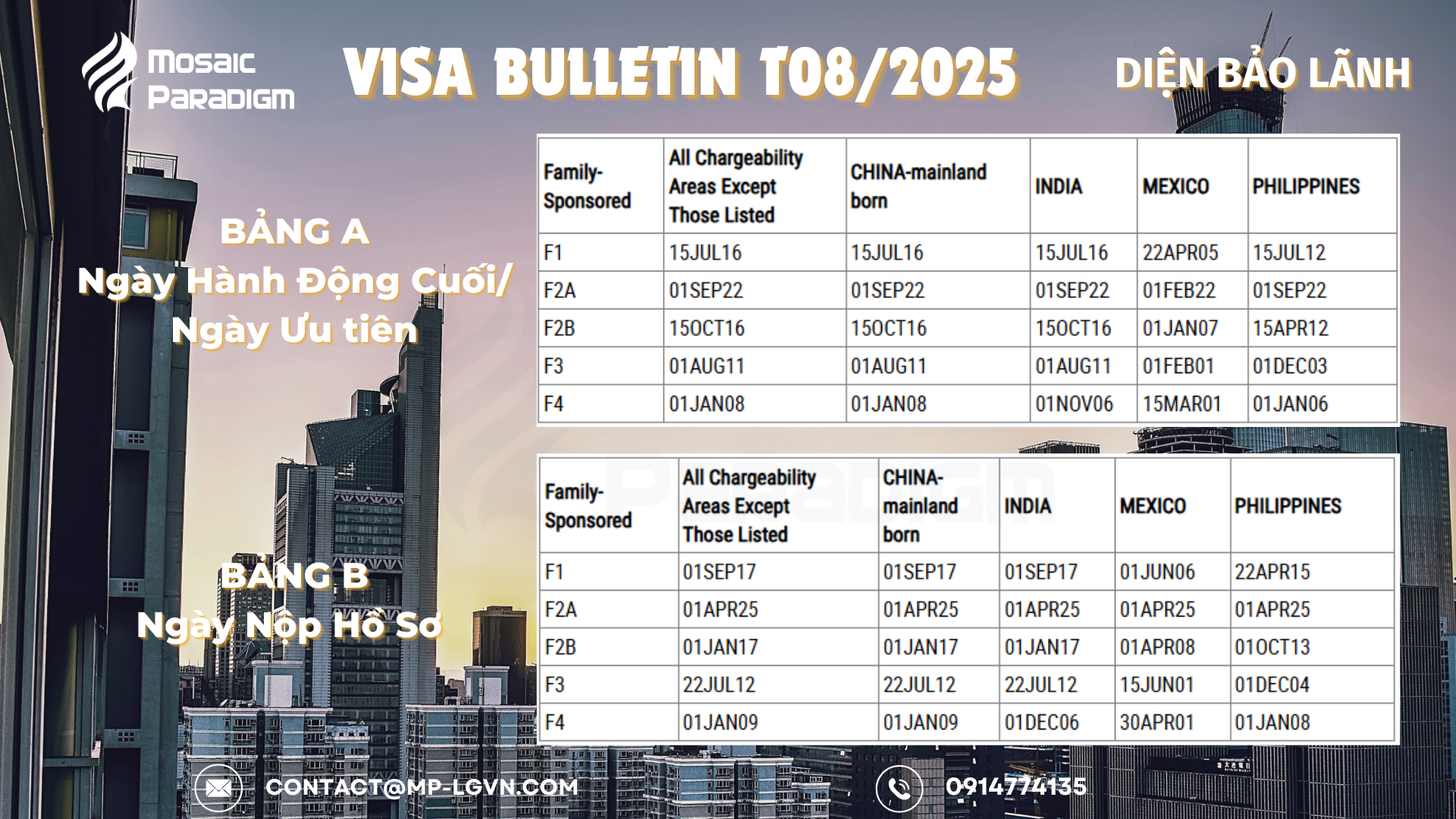 Visa Bulletin tháng 08/2025 ghi nhận sự chững lại ở Diện lao động, đặc biệt là diện EB-2 bị lùi mốc đáng kể so với trước. Trong khi đó, diện bảo lãnh gia đình lại có phần khởi sắc hơn với một vài điều chỉnh tích cực. Do đó, các đương đơn nên theo dõi sát lịch visa để kịp thời chuẩn bị và nộp hồ sơ đúng hạn.