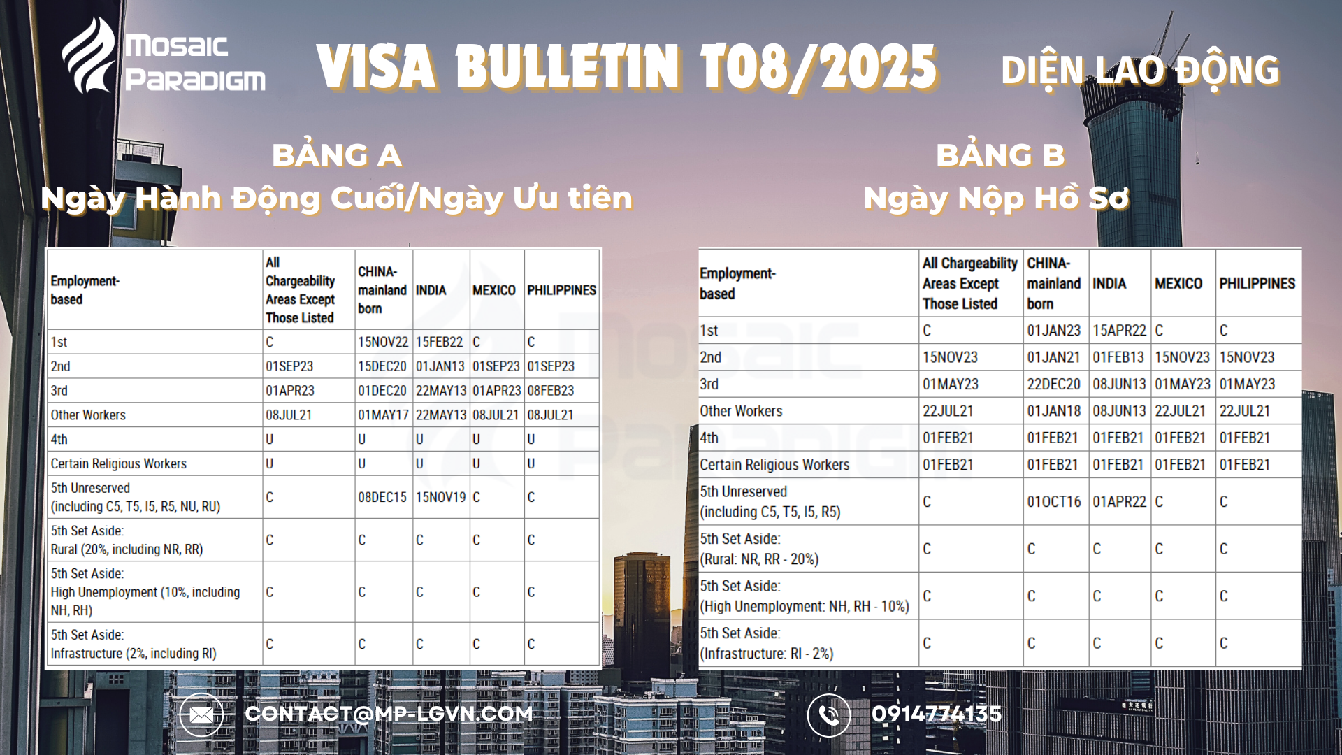 Visa Bulletin tháng 08/2025 – Diện Lao động, Bảng A tiếp tục ghi nhận sự chững lại toàn diện, khi hầu hết các diện giữ nguyên so với tháng trước, không có bất kỳ tiến triển nào đáng kể.