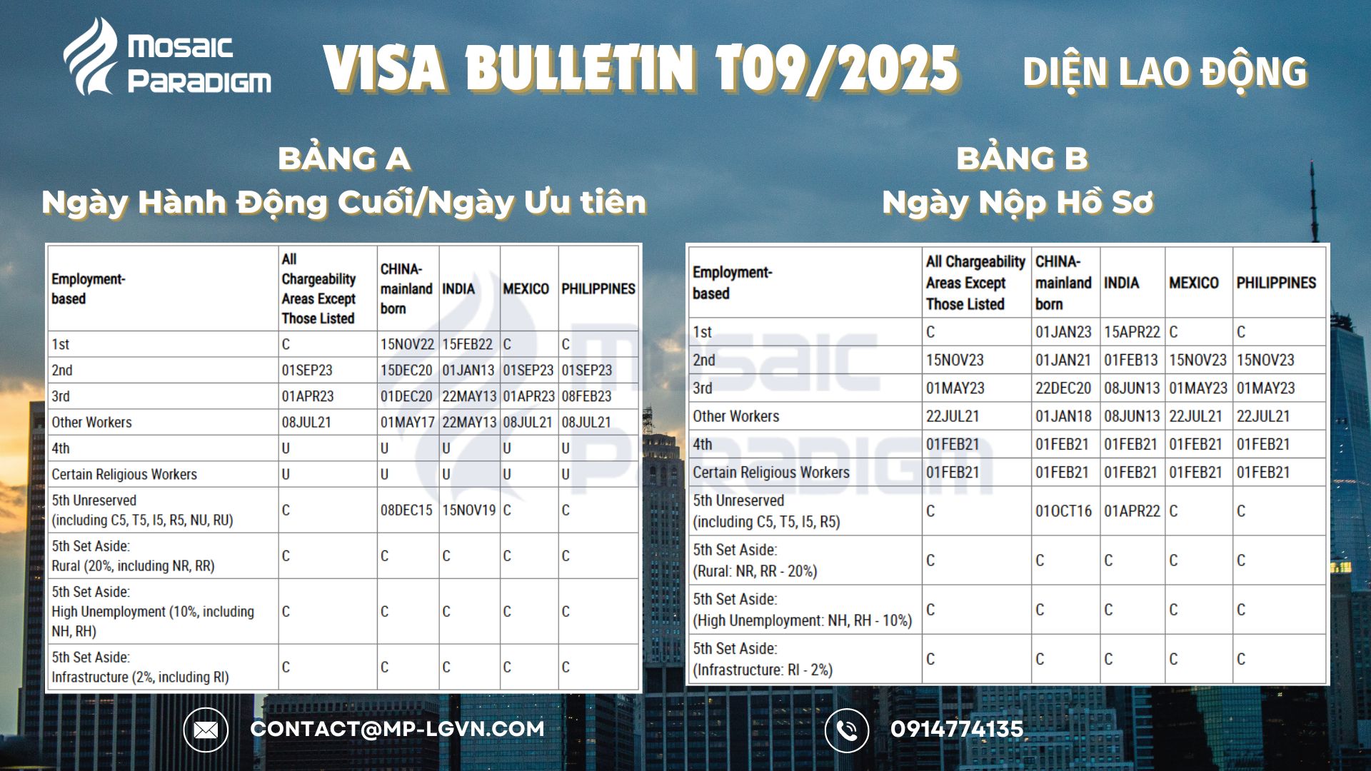 Visa Bulletin tháng 09/2025 – Diện Lao động tiếp tục ghi nhận sự chững lại ở hầu hết các diện, khi Bảng A gần như giữ nguyên so với tháng trước. Tuy nhiên, đáng lưu ý là nguy cơ “tạm ngưng cấp visa” trong tháng này rất cao do đây là tháng cuối của năm tài khóa và số lượng visa cấp phát đã tiệm cận hạn mức.