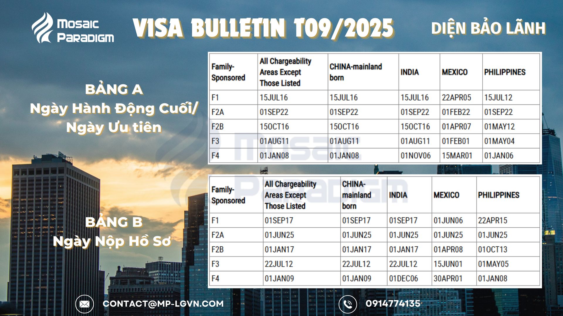 Visa Bulletin tháng 09/2025 cho thấy bức tranh không mấy khả quan, khi cả Diện lao động và Diện gia đình đều chững lại và tiềm ẩn nguy cơ tạm dừng cấp visa do hết hạn mức năm tài khóa. Diện Bảo lãnh Gia đình tuy có một vài tín hiệu tích cực tại Bảng B, nhưng nhìn chung vẫn cần thêm thời gian để có sự cải thiện rõ rệt. Đương đơn ở cả hai nhóm nên theo dõi sát bản tin tháng 10 – thời điểm mở đầu năm tài khóa mới, khi hạn mức visa được cấp lại từ đầu và khả năng dịch chuyển ngày ưu tiên cao hơn.