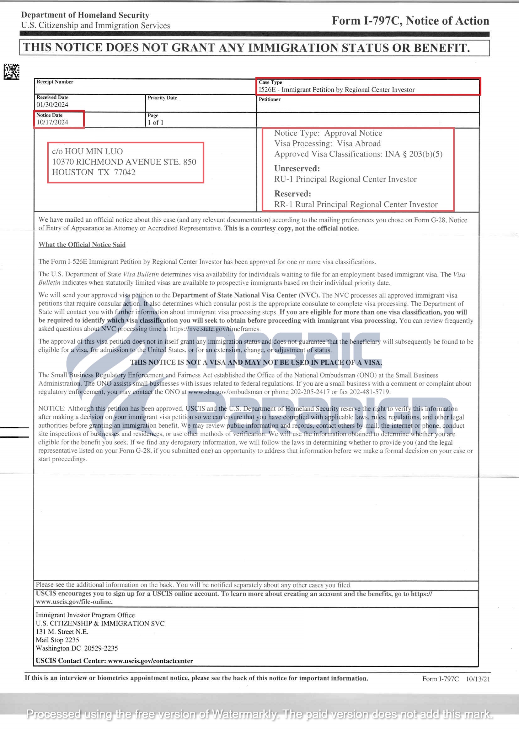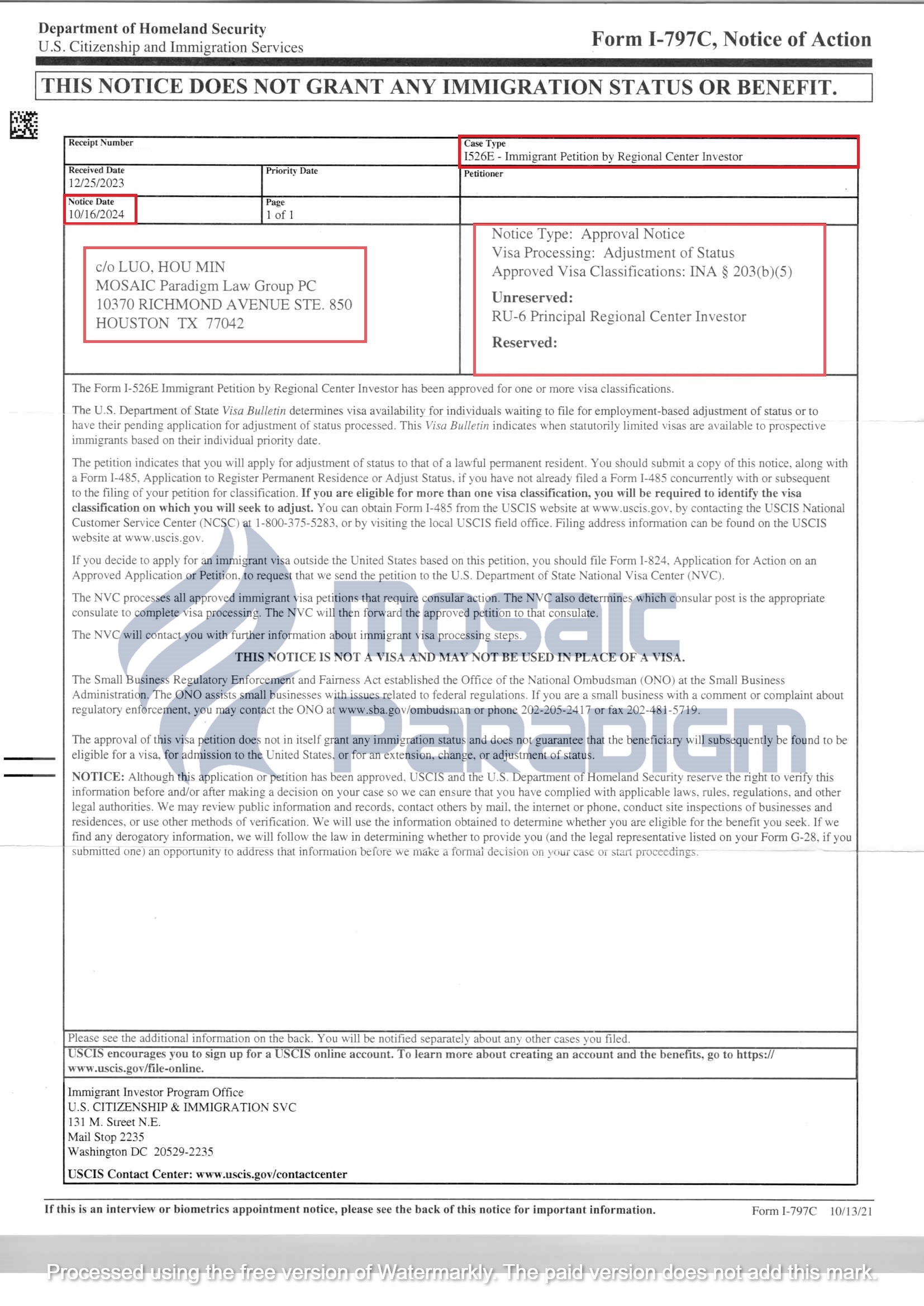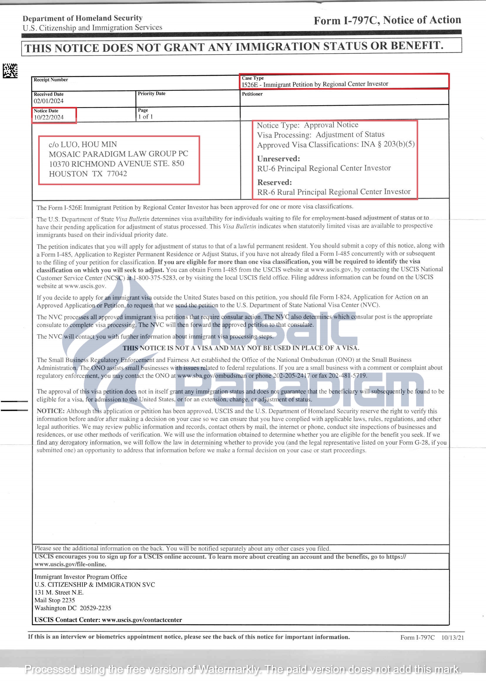 Mosaic Paradigm đón chào tháng 11 đầy niềm vui khi các nhà đầu tư EB-5 của chúng tôi thành công được phê duyệt 3 đơn I-526E liên tiếp từ USCIS. Cả 3 đơn I-526E thành công đều được xét duyệt với thời gian nhanh chóng khi đạt được chấp thuận từ USCIS chỉ sau 8-9 tháng nộp hồ sơ.