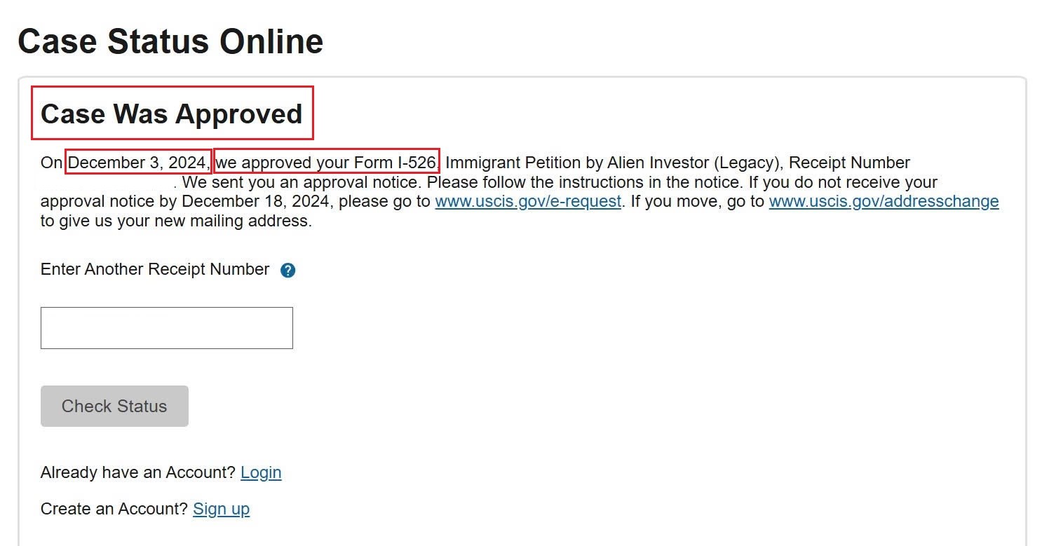 – Ngày chấp thuận đơn I-526: 03/12/2024