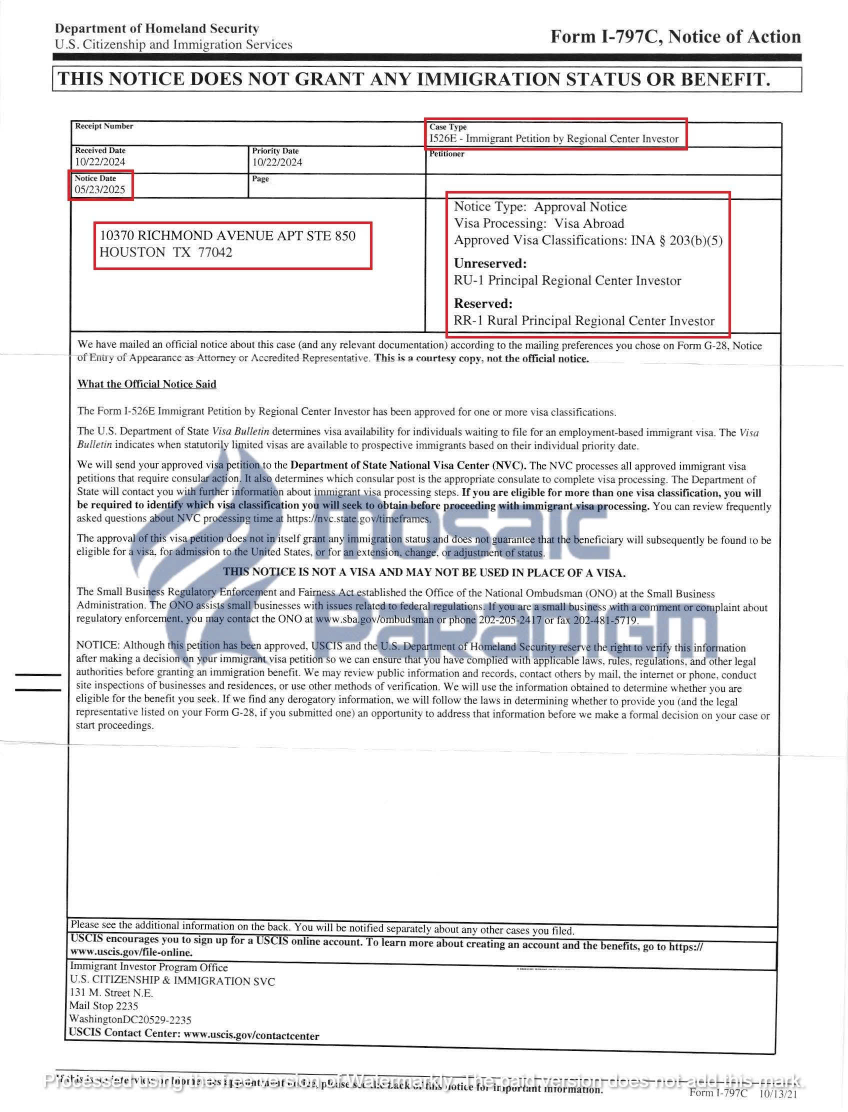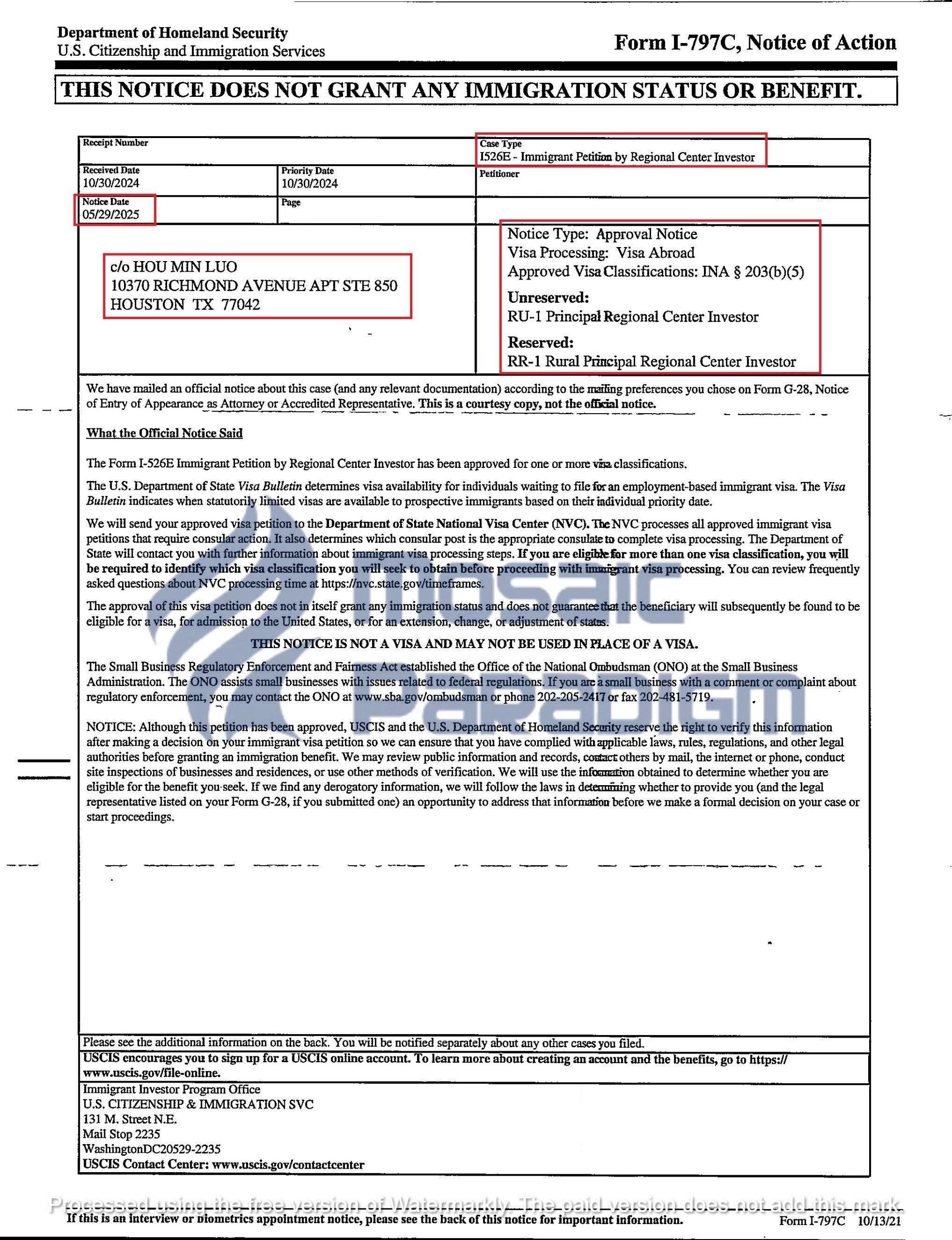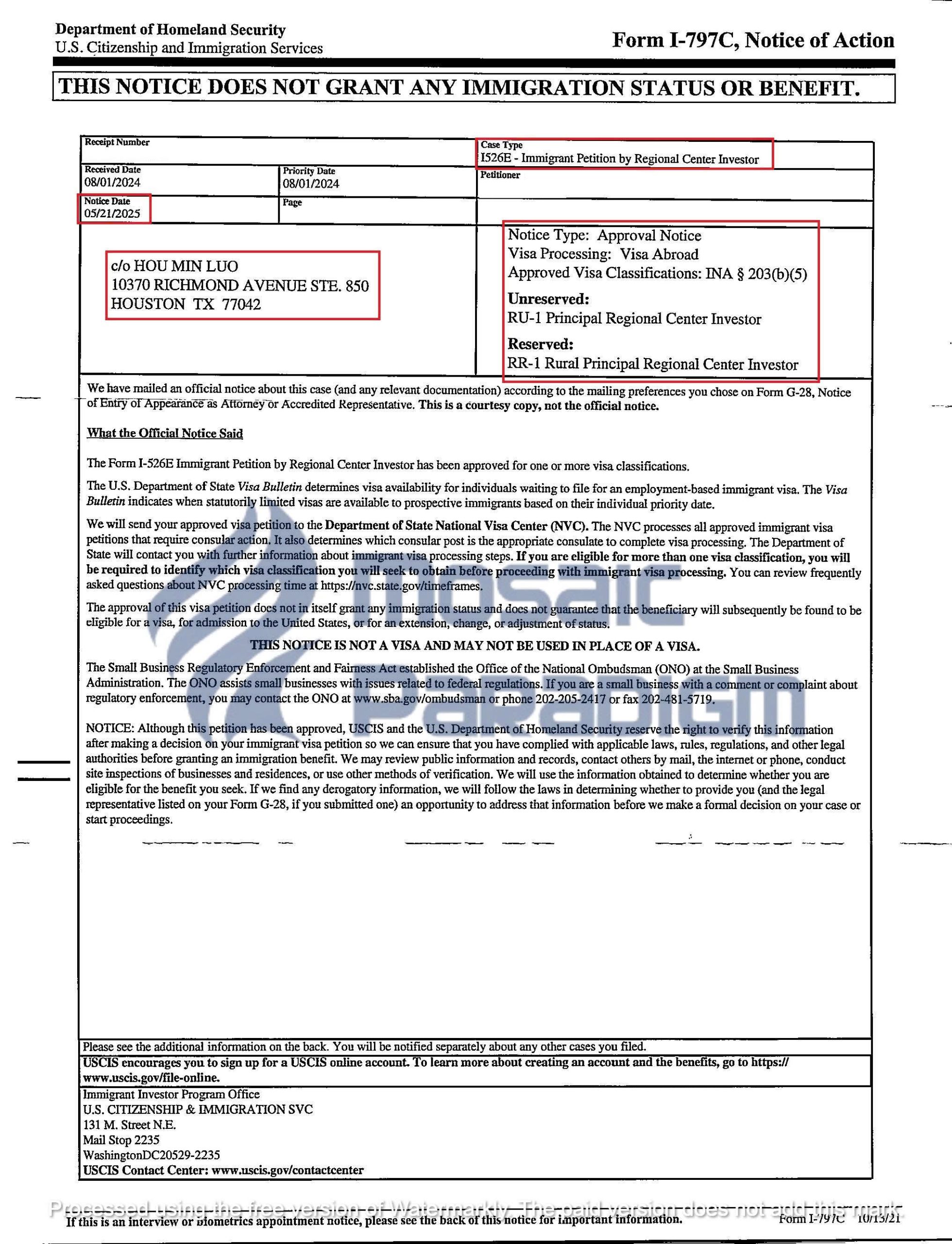Việc được chấp thuận I-526E không chỉ thể hiện sự minh bạch và hiệu quả của dự án đầu tư mà còn phản ánh sự chuẩn bị kỹ lưỡng, đồng hành chuyên nghiệp và nỗ lực bền bỉ của từng nhà đầu tư trong suốt quá trình xét duyệt.