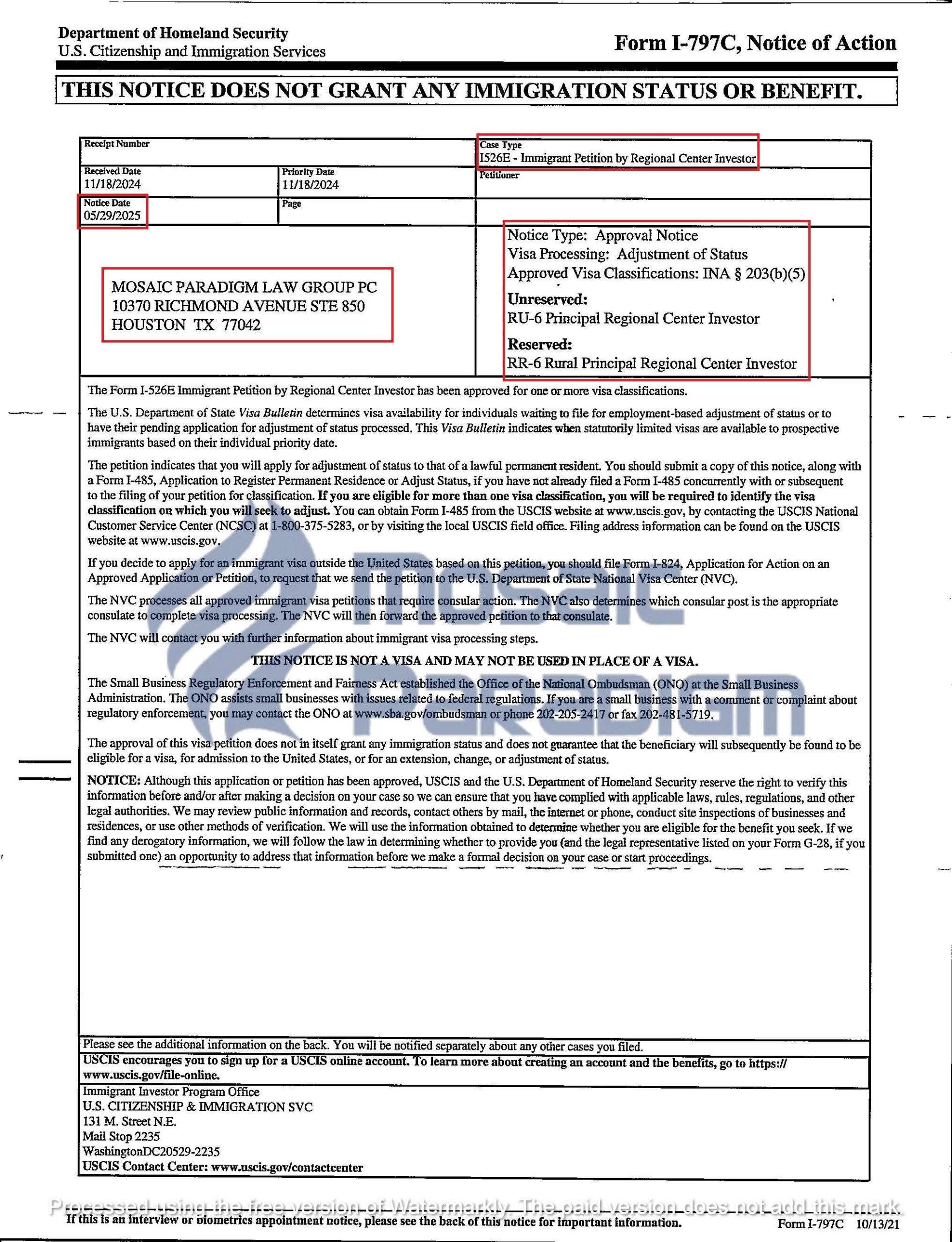Một lần nữa Mosaic Paradigm xin chúc mừng các Nhà đầu tư được phê duyệt thành công đơn I-526E!