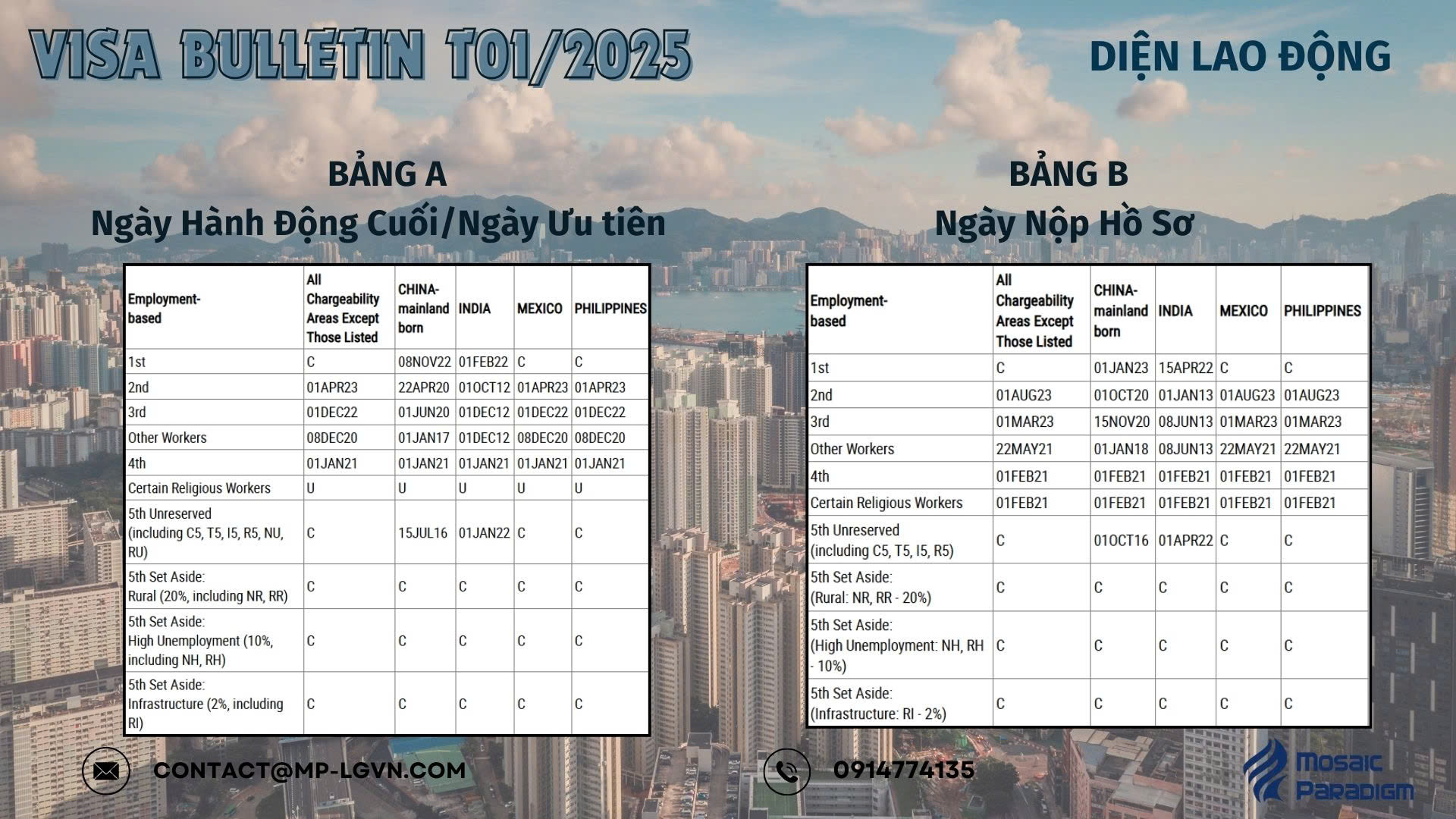 Bộ Ngoại giao Hoa Kỳ vừa phát hành Visa Bulletin tháng 1, đánh dấu bản tin đầu tiên trong năm mới. Theo thông tin mới nhất, nhiều danh mục thị thực theo diện việc làm (EB) và Bảo lãnh (F) đã có sự tiến triển về ngày ưu tiên, cụ thể như sau: